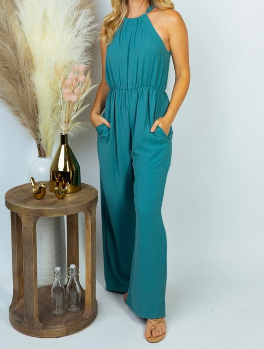 Woven Jumpsuit with round neck featuring side pockets and elastic waist band